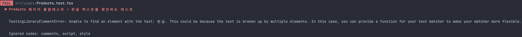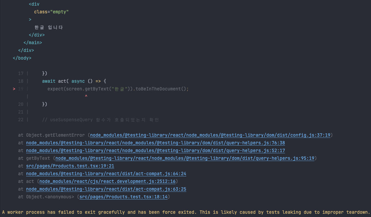 test('한글 텍스트를 확인하는 테스트', async () => { await act( async () => { expect(screen.getByText("한글")).toBeInTheDocument(); }) })