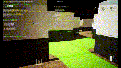 아래는 디버깅했을 때의 이미지인데, 얇은 녹색 줄이 시야 범위이고, 굵은 녹색 줄이 시야 각도이다. 벽 뒤에 감지 범위 내에 플레이어가 있어도 AI는 감지하지 못하고 여전히 패트롤을 하고 있다.