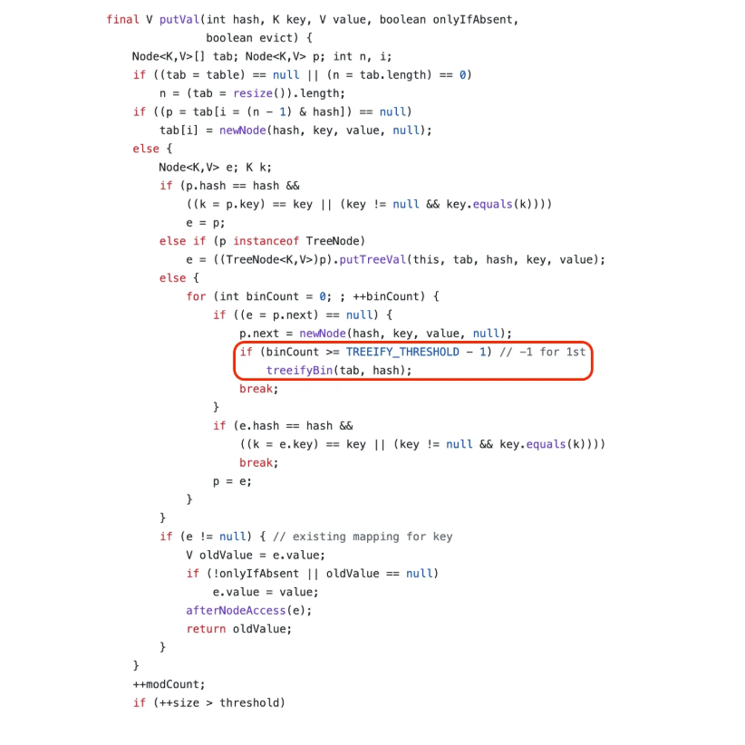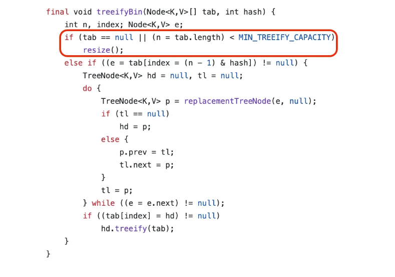 여기서 레드 블랙 트리로 변경하기 전 전체 HashMap의 크기가 64보다 작은 경우 먼저 해시 버킷 배열 확장을 먼저 선행합니다. 왜냐하면 64보다 작을 경우 배열 자체가 적으므로 충돌이 자주 발생할 수 밖에 없기 때문입니다. 이와 관련된 파라미터는 MIN_THREEIFY_CAPACITY 입니다.