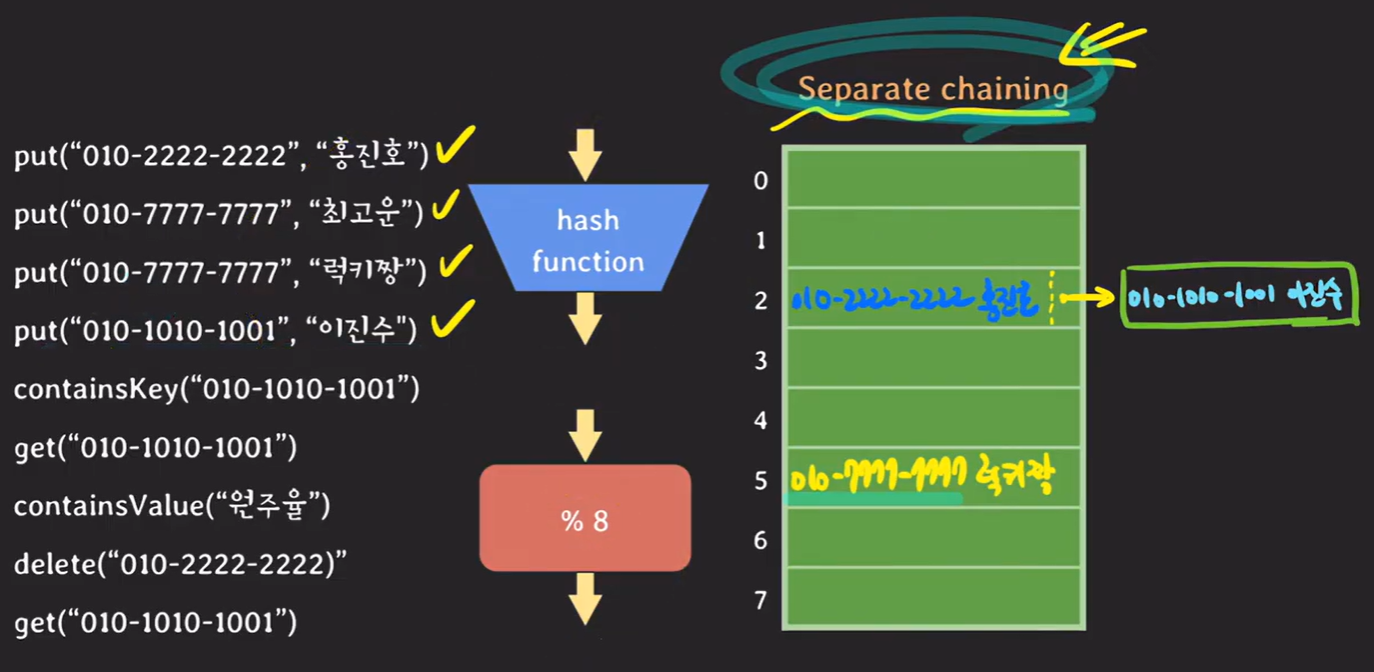 13&7 = 5번 인덱스 (여기서 충돌 발생 separate caining으로 연결됨)