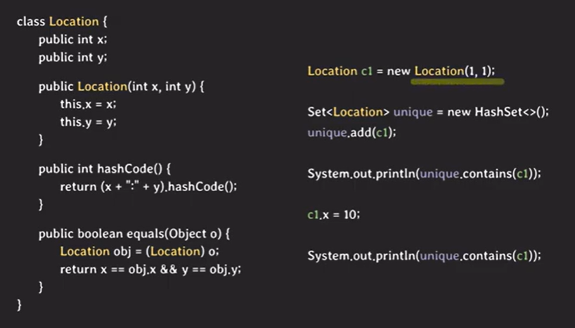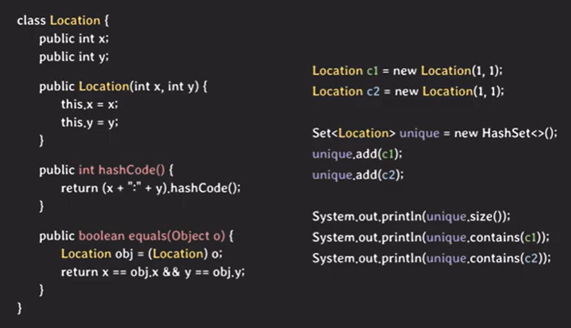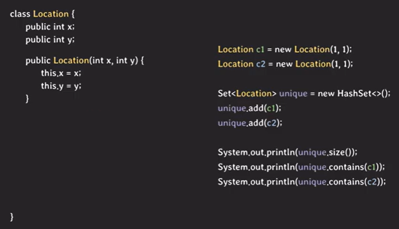 하지만 위와 같이 hashCode()와 equals() 를 재정의하게 되면 이제는 hash 를 구할때 메모리 주소값이 아닌 x값과 y값을 기준으로 판단하므로 메모리 주소가 달라도 동일한 hash 값을 가지게 되고 객체가 동일한지 비교할때에도 메모리 주소값이 아닌 x와 y값을 기준으로 판단하게 됩니다. 즉 이 객체는 앞으로 비교할때 x값과 y값을 기준으로 값이 같으면 같은 객체로 판단되게 됩니다.