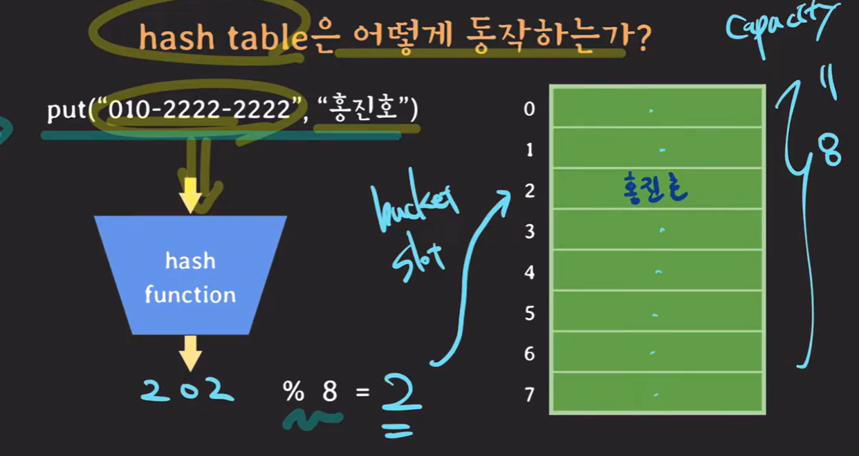 key 값을 hash function 에 넣으면 hash 정수 int 값이 output으로 나오게 되고 나온 hash 값을 HashMap의 배열 길이인 capacity 값으로 나눈 나머지 값을 인덱스로 하여 해당 버킷에 저장되는 방식입니다.