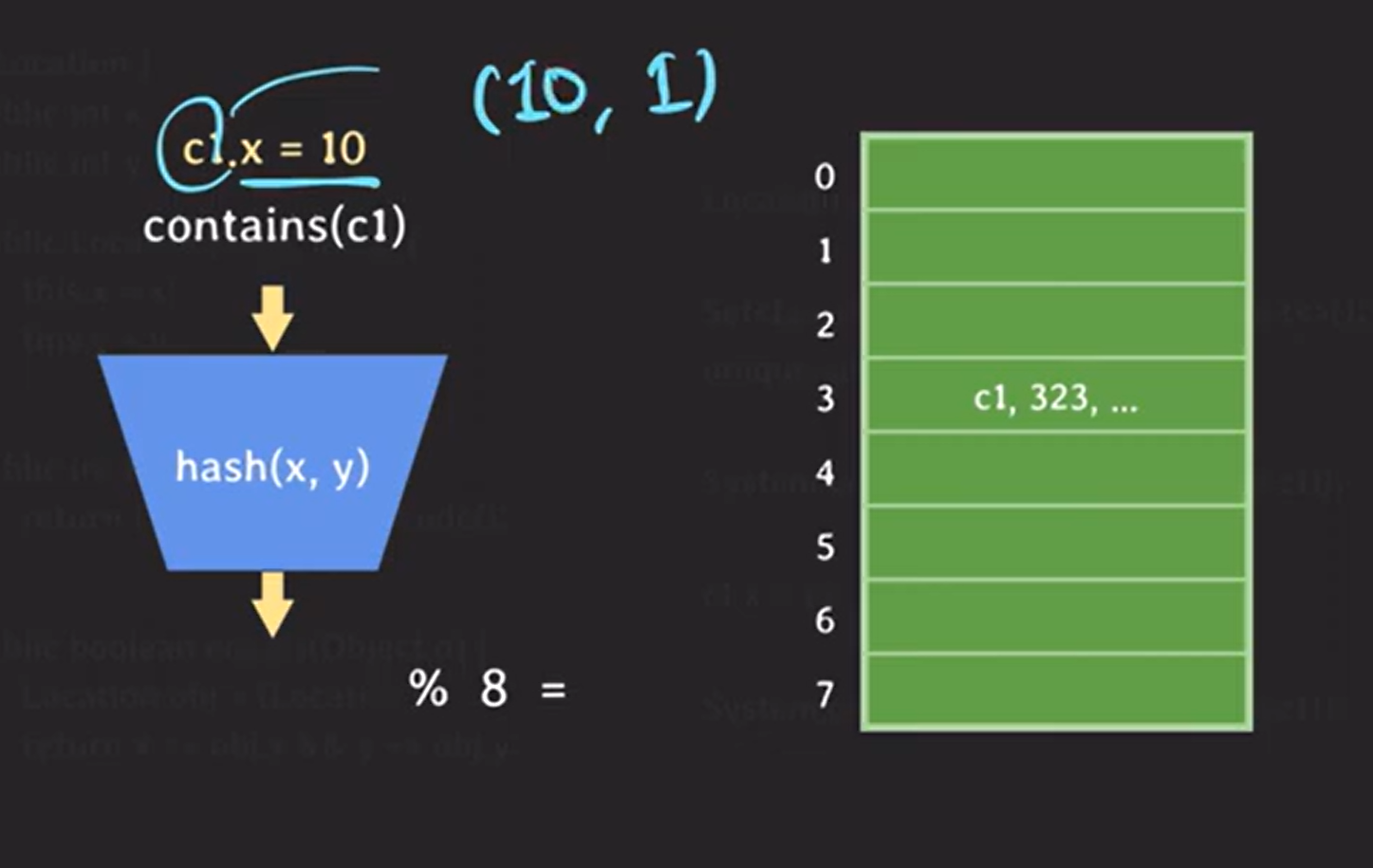 여기에서 저희는 이전에 hashCode() 와 equals()를 재정의 하였습니다. 그러므로 이는 동일한 c1 객체라 하더라도 x값이 1에서 10을 변경되었으므로 hash function을 통해 나오는 hash 값은 다른 값이 나옵니다. 따라서 다른객체로 판단되어 결과는 false로 나오게 됩니다.