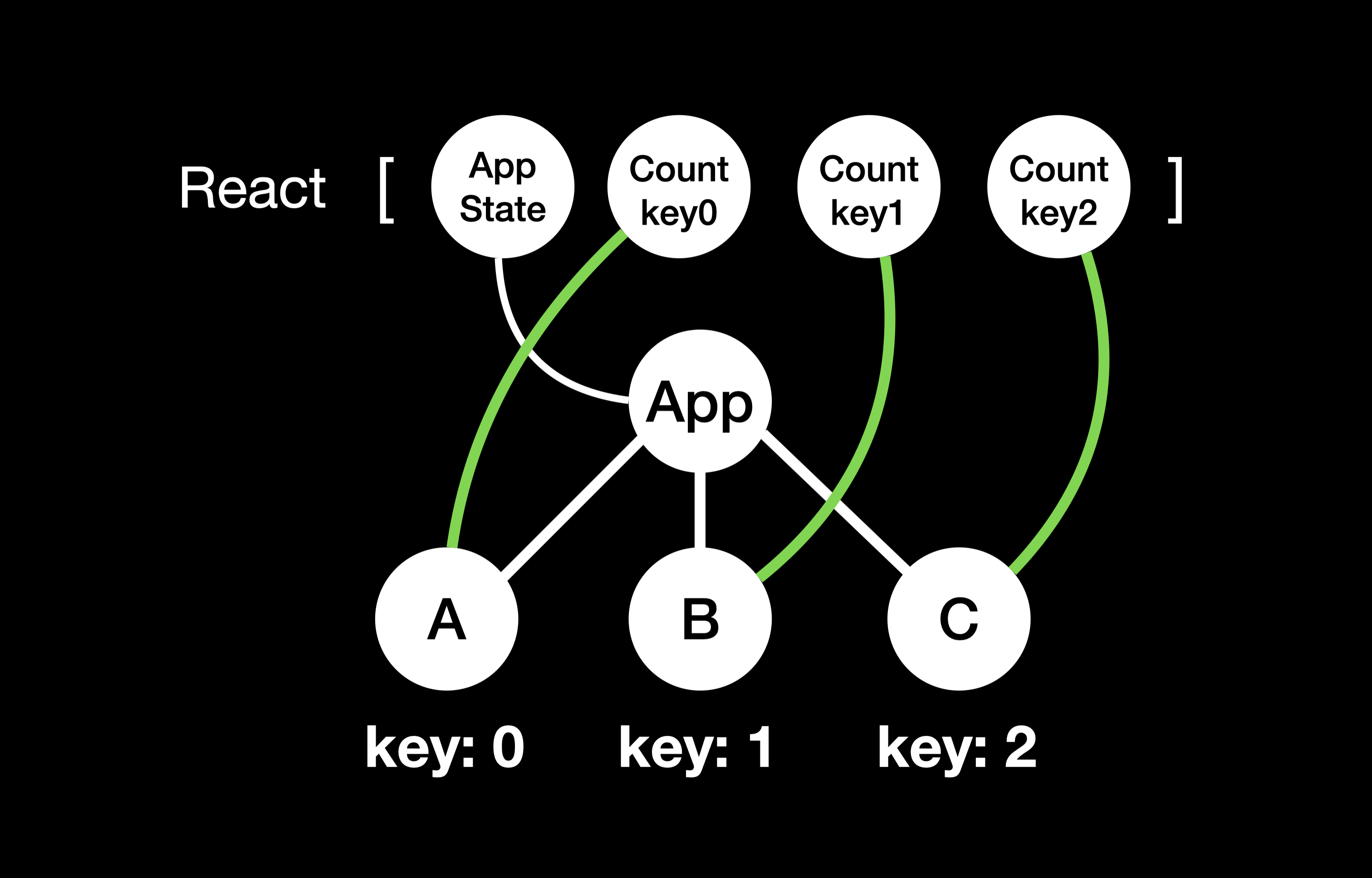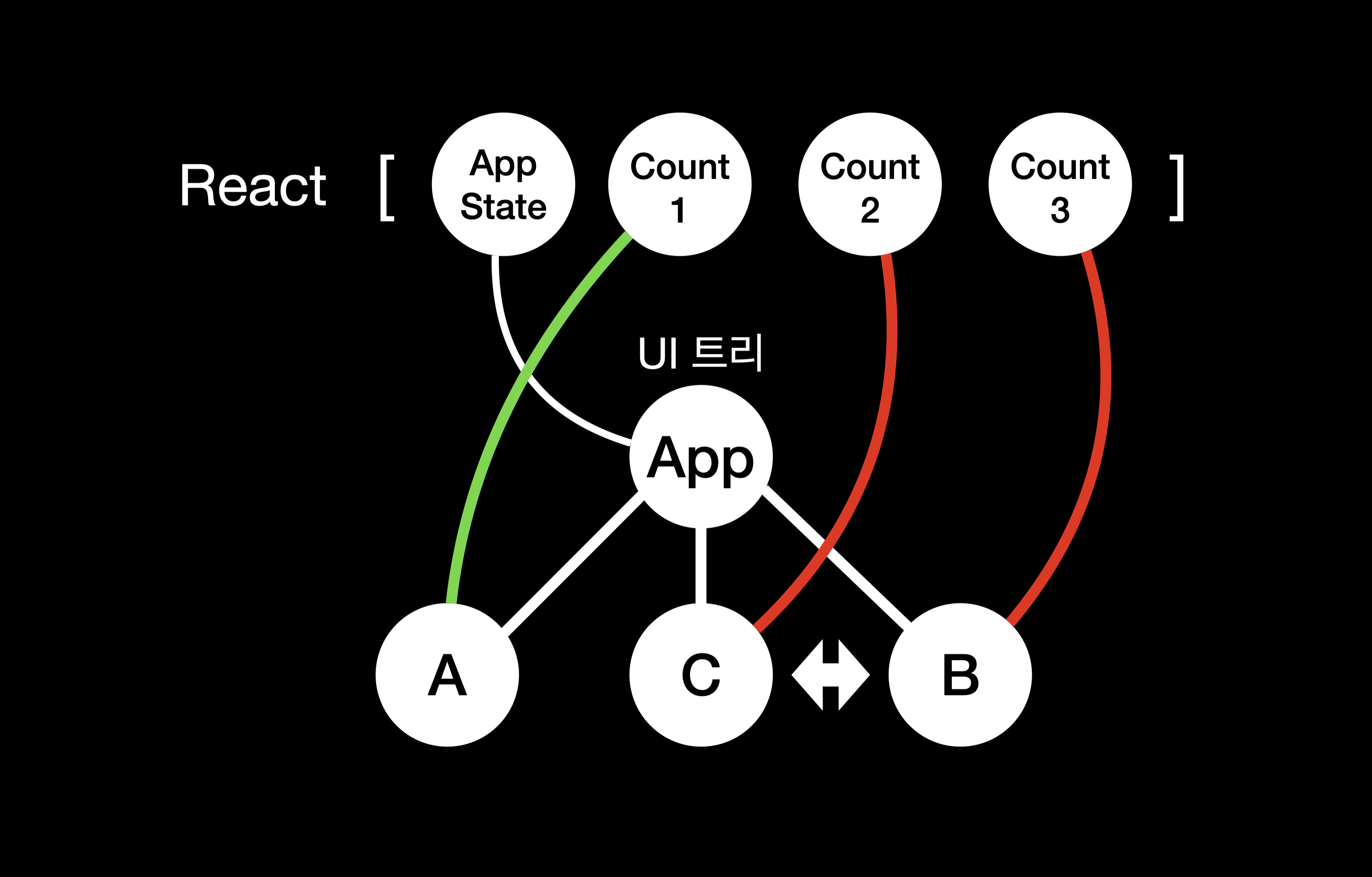 각각 A, B, C 라는 name 속성을 가진 세 컴포넌트가 존재하고, 이 컴포넌트들은 모두 각자의 count 상태를 가지고 있다