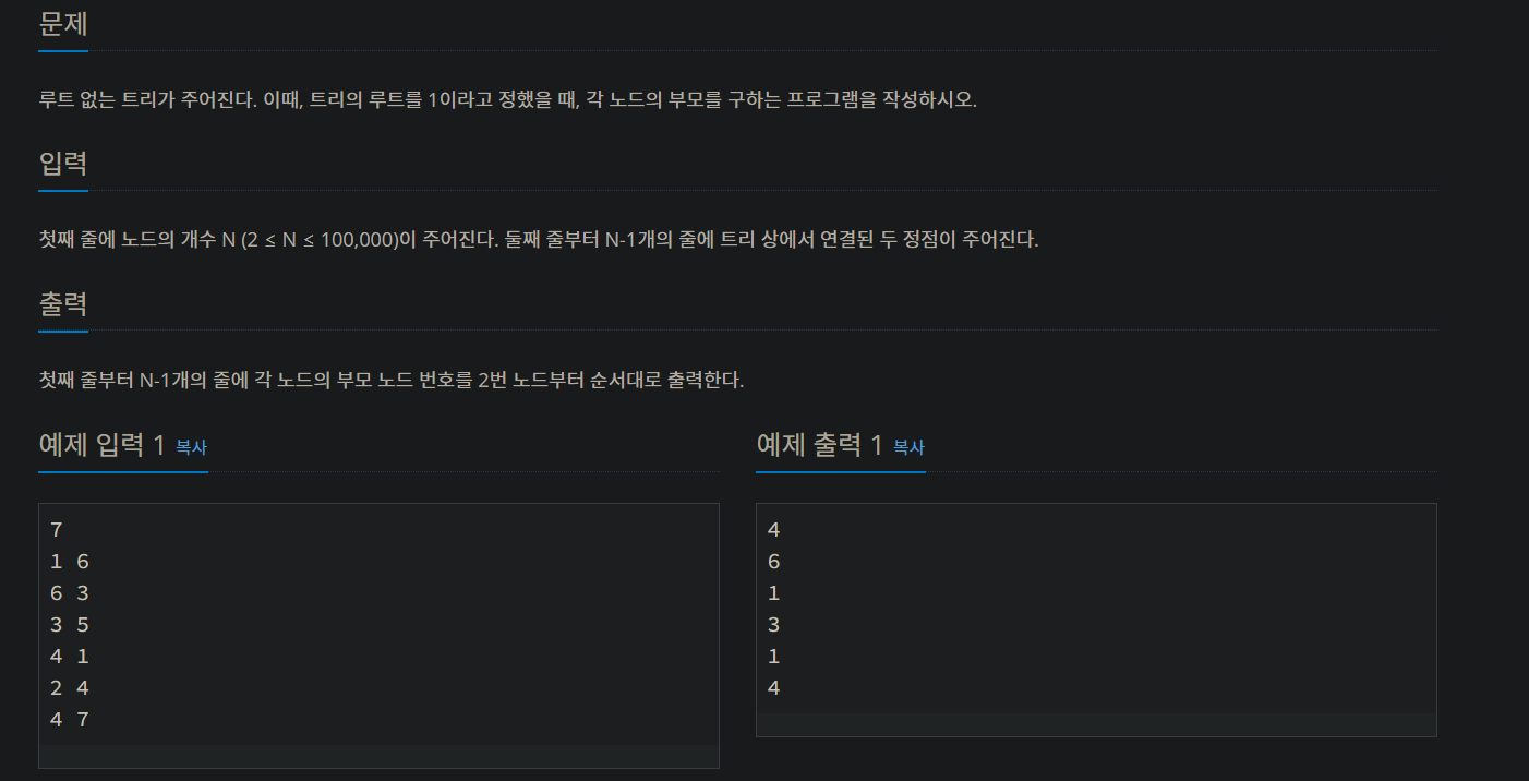 DFS를 적용하면 부모노드에서 자식 노드로 간다는 점을 생각해보면 될 거 같다! 2번노드부터 차례대로 부모노드를 출력시키는 문제인데, 이전에 풀었던 dfs문제에서는 visited를 통해 방문한 노드인지 판별했었다