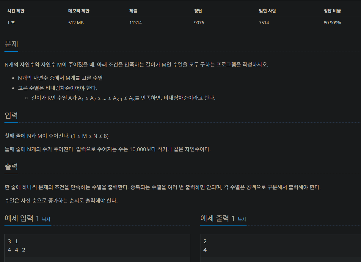 이번 문제는 수열이 비내림차순이어야 한다고 한다. 그렇기 때문에 백트래킹을 걸어줄 때, 인덱스 값 + 1을 계속 해주면서 추가를 해주는데 중복은 없애서 출력해야 하기 때문에 값들을 check로 받아주면서 확인했다.