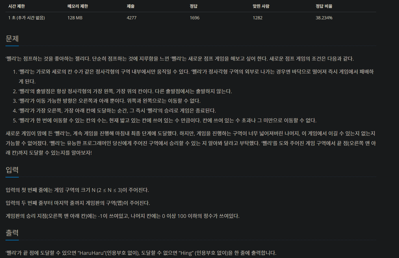 DFS로 탐색을 하면서 정사각형 구역 내의 수가 -1인 순간에 HaruHaru를 출력하고 exit()함수로 종료하도록 구현했다.