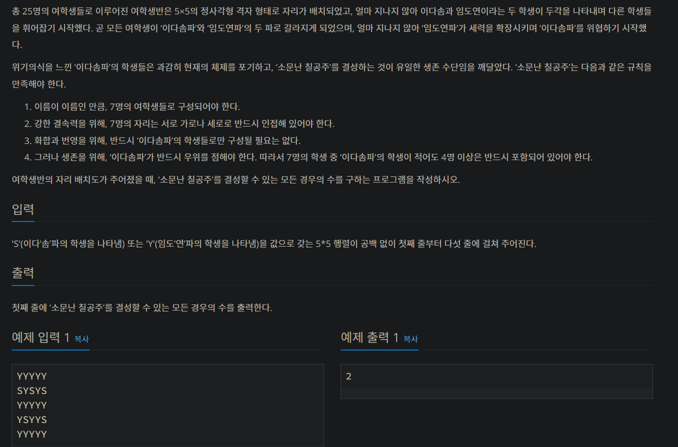 처음엔, 인접한 학생들로만 추가를 하면서 'S'의 수를 세어볼려고 했지만 dfs만으로 모든 경우의 수를 셀 수 있을지도 몰랐기에 접근법을 다르게 생각했다.