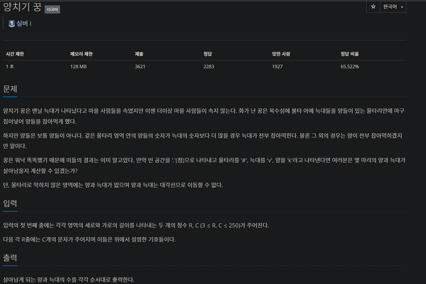 함수에서는 queue에 좌표를 넣어주고 늑대 or 양에 따라 개수를 늘려나가고 종료되면 그 수를 리턴하면서 최종 수를 늘려나간다.