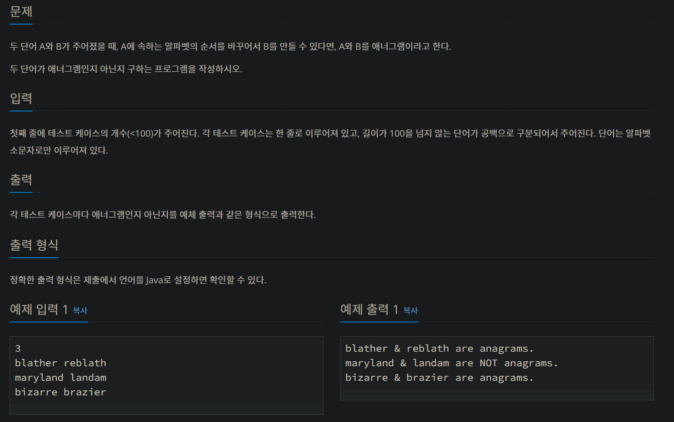 a, b 문자열을 입력받은 다음 정렬시켰을때 값이 같다면 are anagrams.를 출력하도록 하고, 같지 않다면 are NOT anagrams.를 출력하도록 했다.
