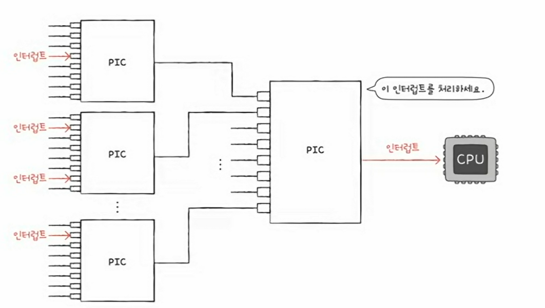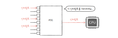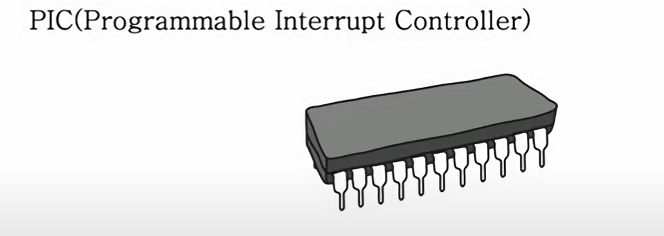 PIC는 여러 장치 컨트롤러에 연결되어 장치 컨트롤러에서 보낸 하드웨어 인터럽트 요청들의 우선순위를 판별한 뒤 CPU에 지금 처리해야 할 하드웨어 인터럽트는 무엇인지를 알려주는 장치이다.