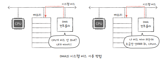 하지만 DMA 컨트롤러는 시스템 버스로 메모리에 직접 접근하는데, 시스템 버스는 공용 자원이기 떄문에 동시 사용이 불가능하다. 따라서 CPU가 시스템 버스를 사용할 때 DMA 컨트롤러는 시스템 버스를 사용할 수 없고, DMA 컨트롤러가 시스템 버스를 사용할 때는 CPU가 시스템 버스를 사용할 수 없다.