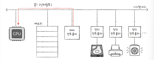 3. 입출력 작업이 끝나면 DMA 컨트롤러는 CPU에 인터럽트를 걸어 작업이 끝났음을 알린다.