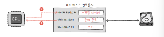 ex) ‘518번지에 a를 써라’라는 명령어로 하드 디스크 컨트롤러의 데이터 레지스터로 데이터를 보낼 수 있다.