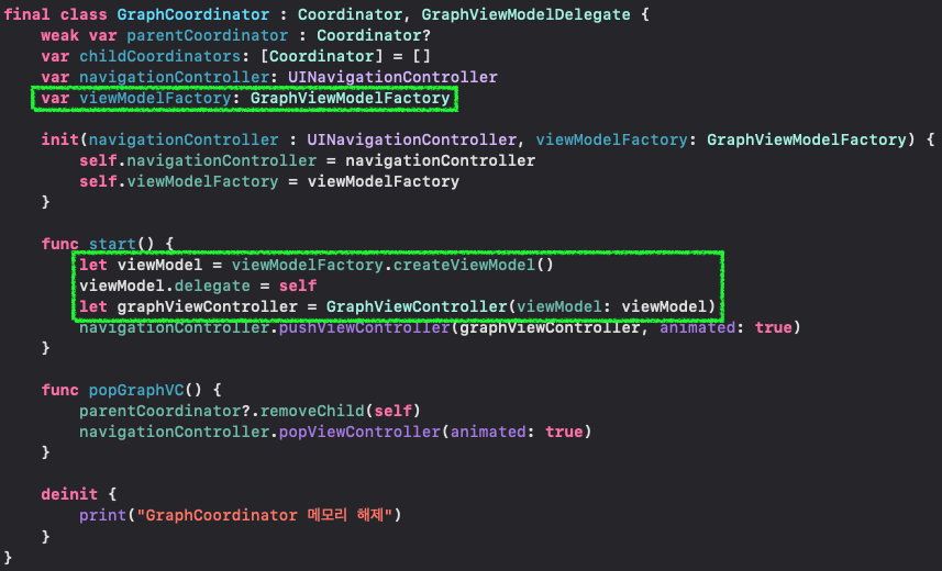 DI Container 는 싱글톤 객체로 수명주기가 앱이 종료될 때까지 살아있게 됩니다. 그렇다면 DI Container 에서 저장하고 있는 GraphViewModel 도 GraphViewController 의 생명주기와 관계없이 앱이 종료될 때까지 계속해서 살아있게 됩니다. 이것은 곧 메모리 누수로 이어질 수 있습니다.