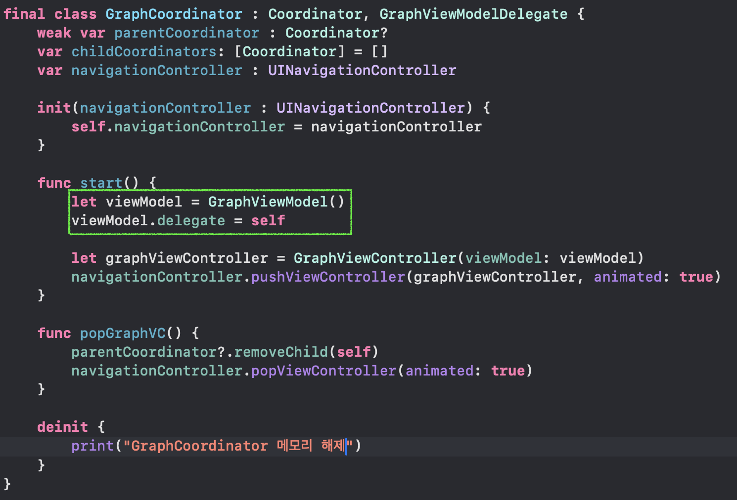 위의 예시 코드는 Coordinator 객체의 구현부이며, 화면 전환의 책임을 담당하고 있습니다.