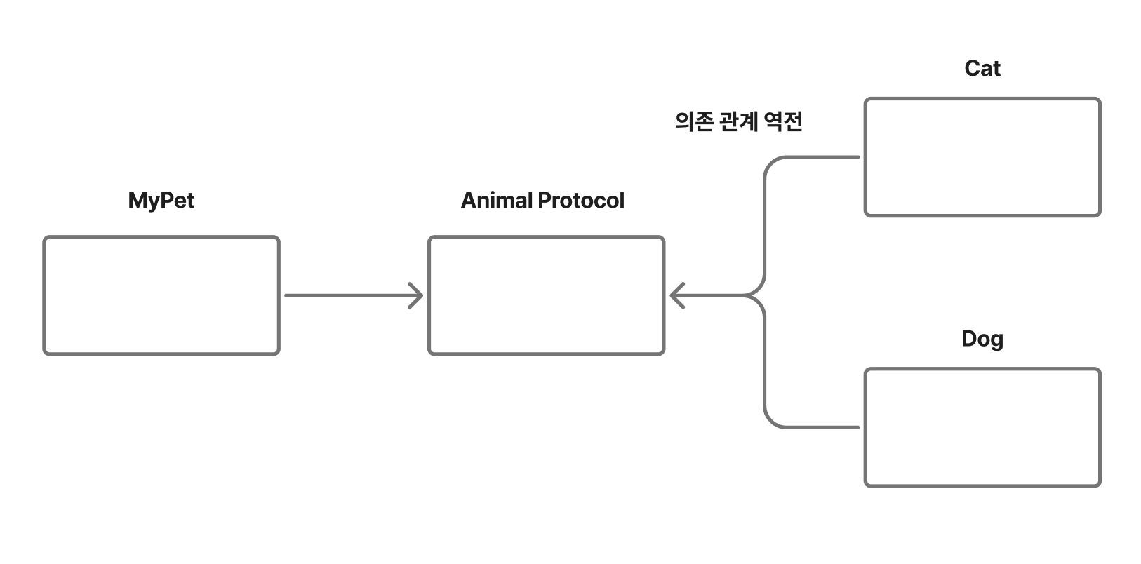 또한 Dog 와 Cat 객체가 Animal 프로토콜에 의존하는 관계가 생기기 때문에 이것을 바로 의존성 역전이라고 부릅니다.