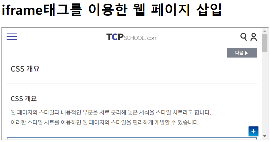 iframe 요소를 이용하면 해당 웹 페이지 안에 어떠한 제한 없이 또 다른 하나의 웹 페이지를 삽입할 수 있다.