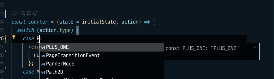 type: PLUS_ONE, // type에는 위에서 만든 상수로 사용 (vscode에서 자동완성 지원)