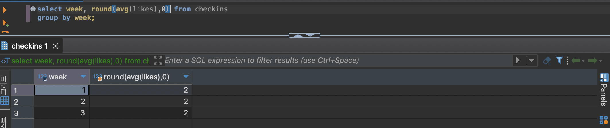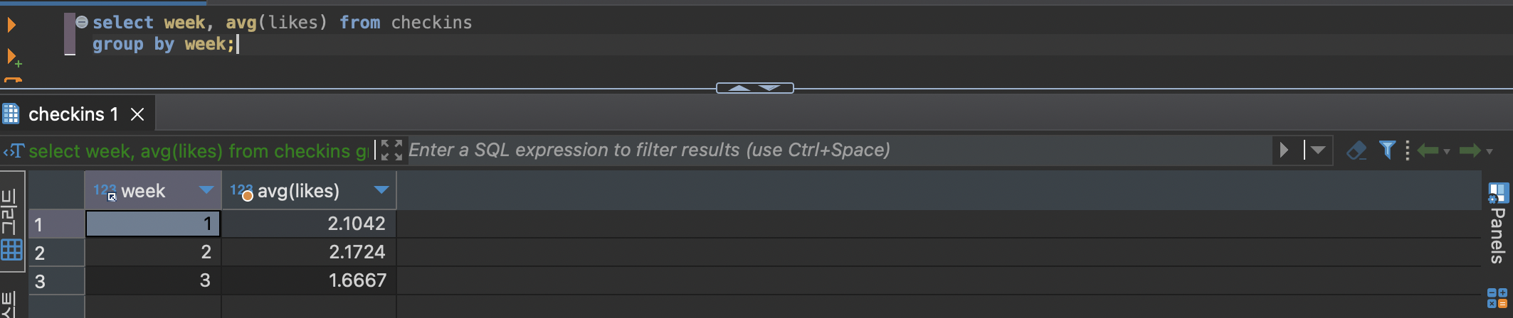 select week, avg(likes) from checkins