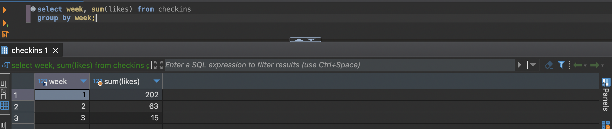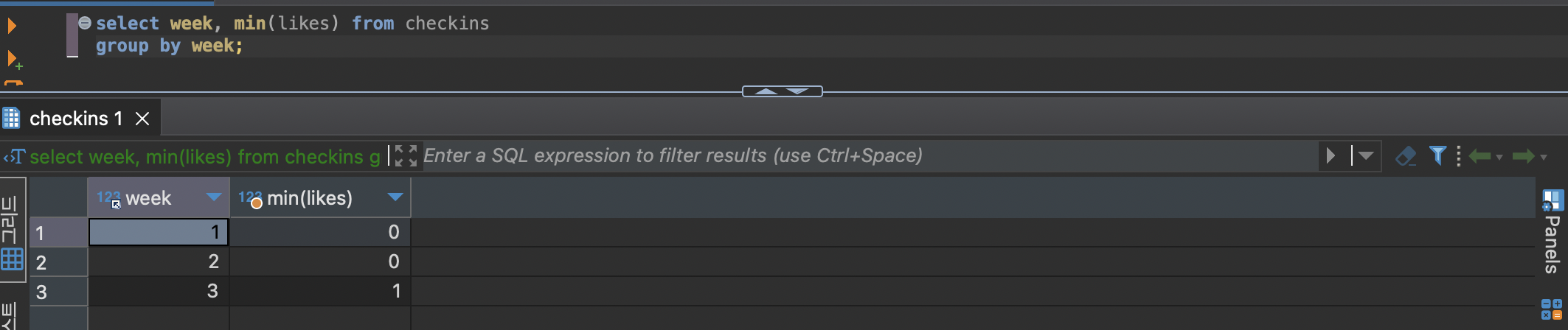 select week, min(likes) from checkins