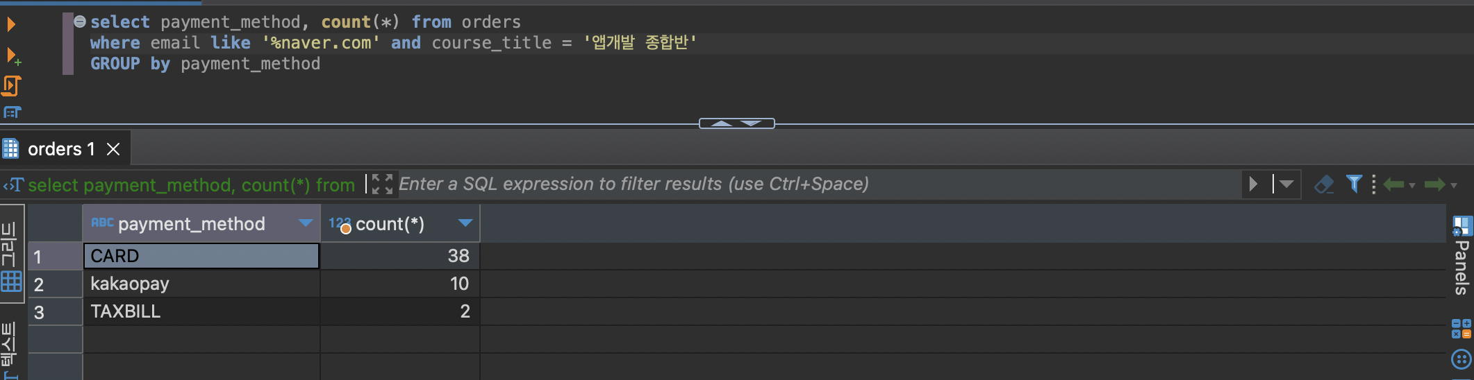 [숙제] 네이버 이메일을 사용하여 앱개발 종합반을 신청한 주문의 결제수단별 주문건수 세어보기