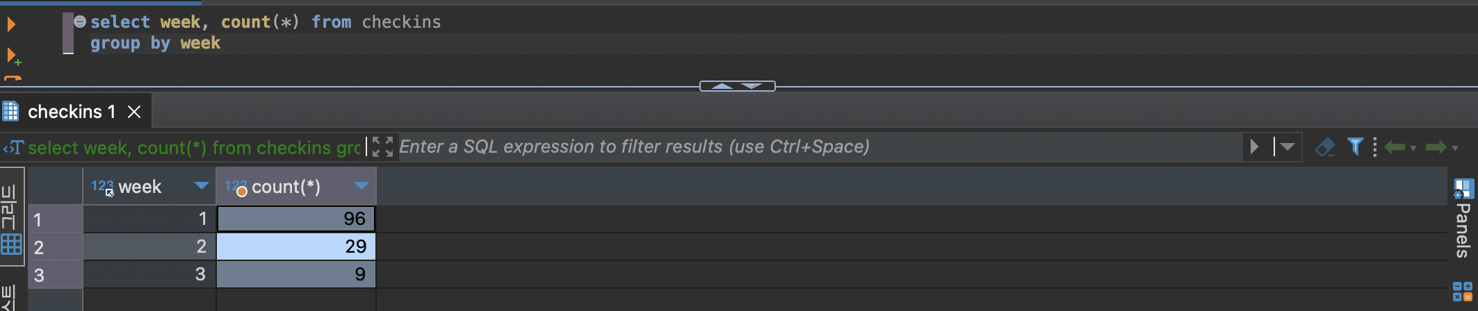 select week, count(*) from checkins