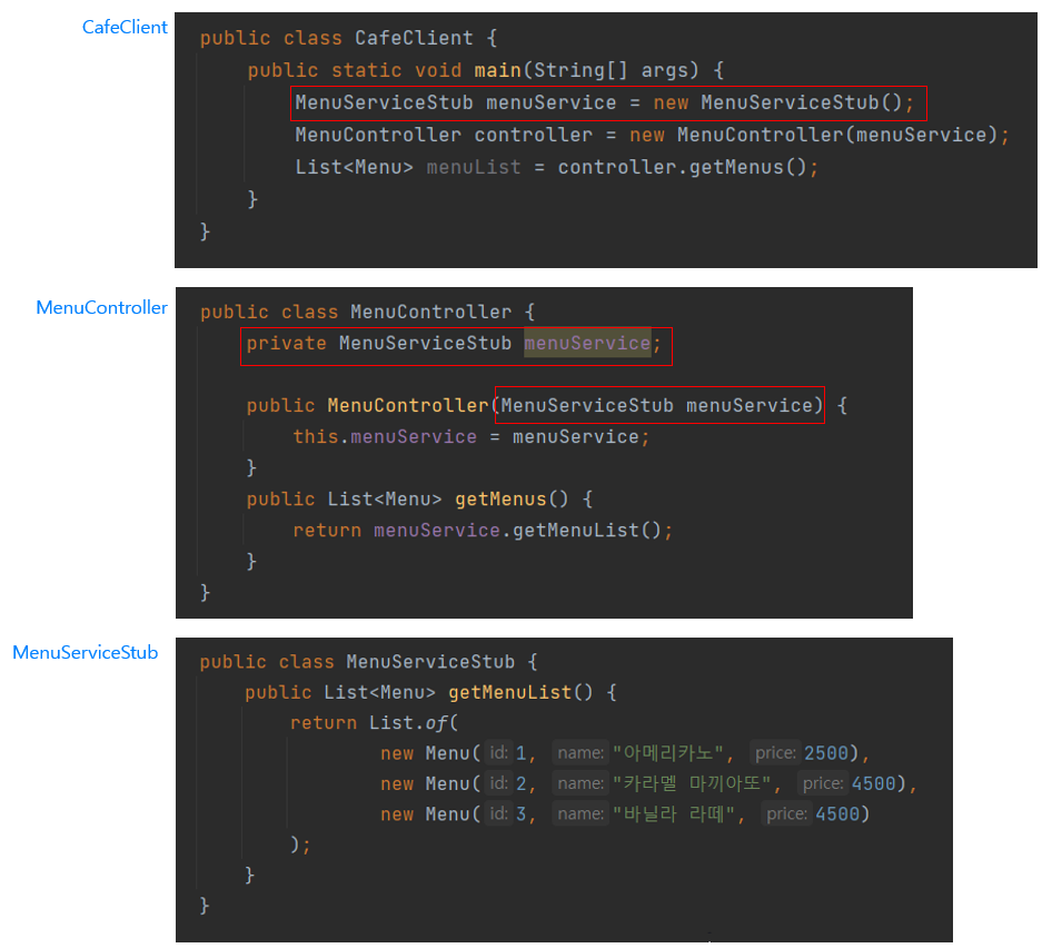 만약 빨간색 네모칸에 있는 menuService를 menuServiceStub으로 바꿔야하는 상황이 왔다.