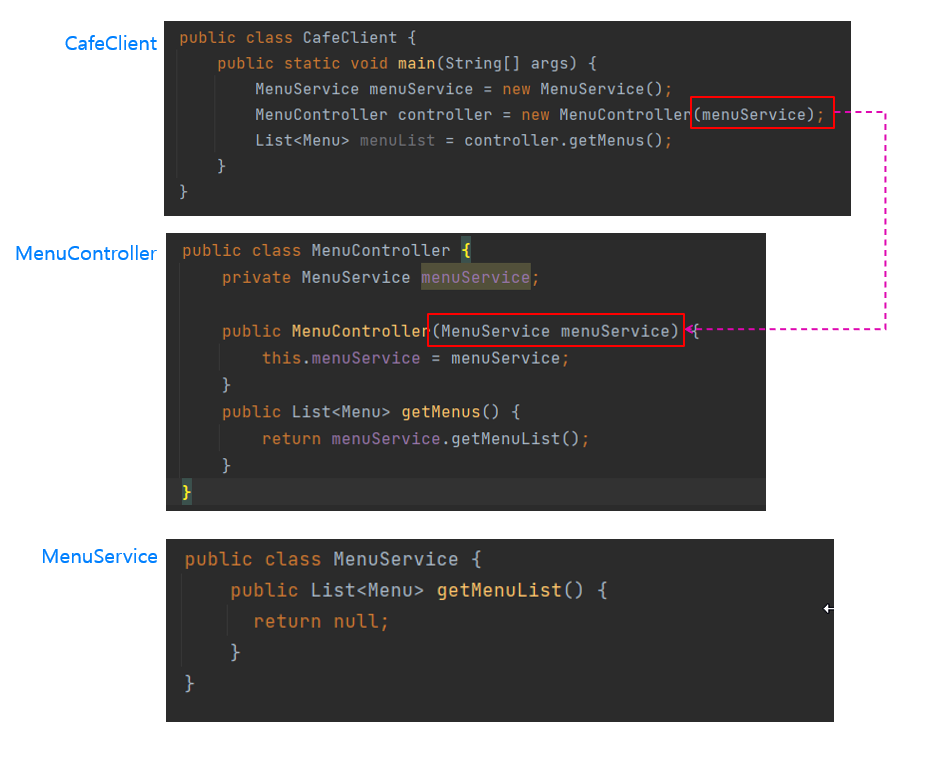바로 CafeClient클래스가 MenuController의 생성자 파라미터로 menuService를 전달하고 있기 때문에 객체를 주입해주는 외부가 된다.