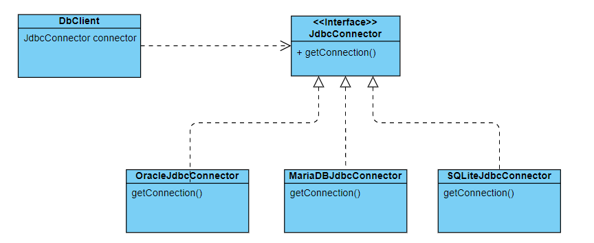 그림에서 DbClient는 OracleJdbcConnector, MariaDBJdbcConnector, SQLiteJdbcConnector 같은 JdbcConnector인터페이스의 구현체에 직접적으로 연결해서 Connection을 얻는 게 아니라 JdbcConnector 인터페이르를 통해 간접적으로 연결되어(느슨한 결합) Connection 객체를 얻는 것을 볼 수 있다.
