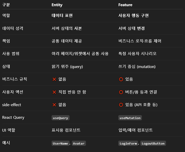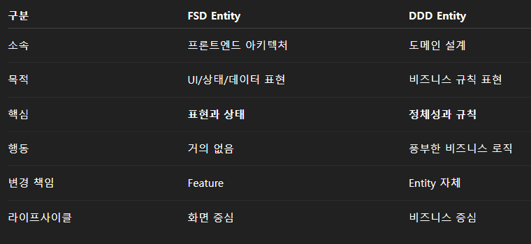FSD의 Entity는 도메인 데이터를 프론트엔드에서 표현하기 위한 모델이다. 관련 사용자 행동과 관련된 비즈니스 규칙은 Feature 레이어에서 처리하게 된다.