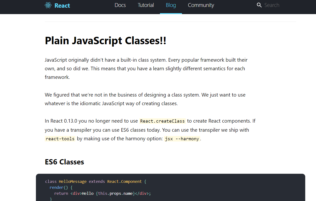 https://legacy.reactjs.org/blog/2014/03/28/the-road-to-1.0.html Before we even launched React publicly, members of the team were talking about how we could leverage ES6, namely classes, to improve the experience of creating React components. Calling