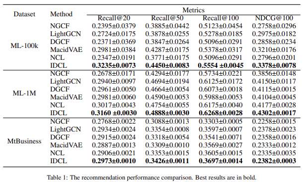 - 실험 결과는 IDCL이 추천의 성능을 상당히 높였다는 것을 입증