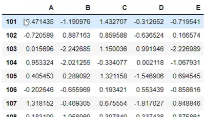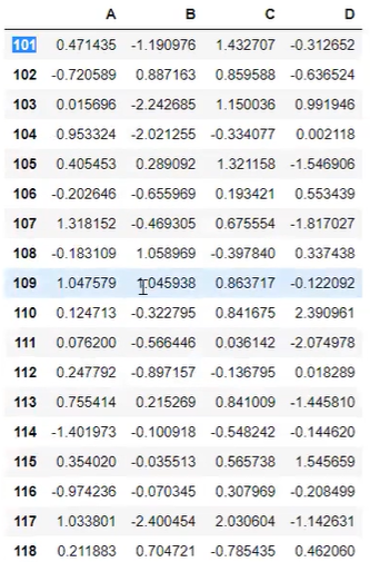 df=pd.DataFrame(np.random.randn(20,4), index=np.arrange(101,121),columns=['a','b','c','d'])