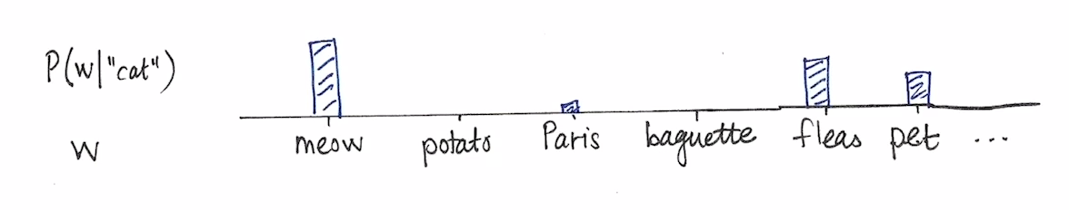 위 단어들을 벡터를 통해 좌표공간으로 표현한다면, 'kitty'와 'cat'은 비슷한 위치할 것이다. 그러나 'hamburder'는 꽤 먼 거리에 표현될 것이다. 이와 같이 유사한 단어는 가까이, 유사하지 않은 단어는 멀리 위치하는 것을 '최적의 좌표값'으로 표현할 수 있다.