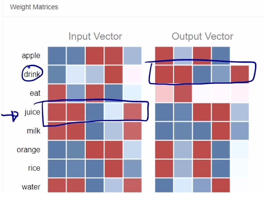 위의 연산이 반복되면서, 같이 등장하는 단어들 간의 벡터표현이 유사해지는 것을 아래 사이트에서 확인할 수 있다.