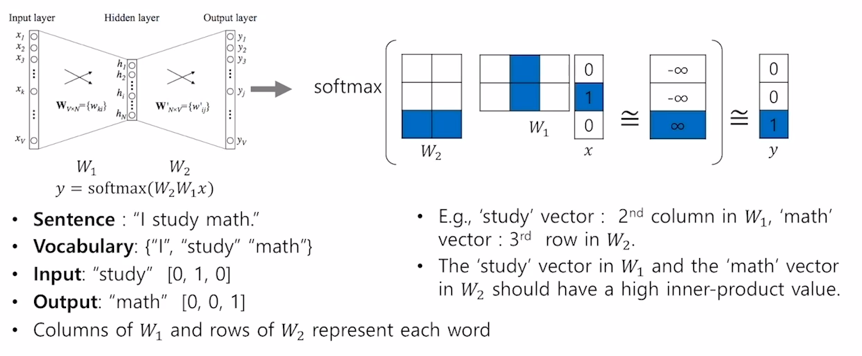 예를 들어 “I study math”라는 문장의 중심단어가 study 라고 한다면, (I study), (study I) , (study math) 와 같은 단어쌍을 학습 데이터로 구축한다.