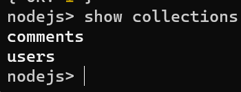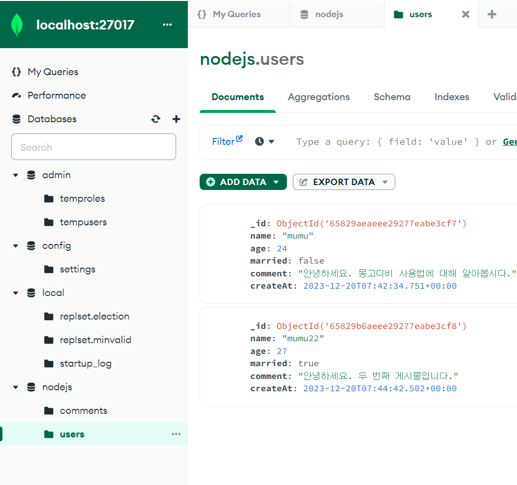 nodejs> db.users.insertOne({ name: 'mumu22', age: 27, married: true, comment: '안녕하세요. 두 번째 게시물입니다.', createAt : new Date() });