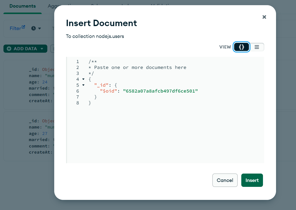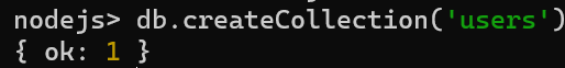 nodejs> db.users.insertOne({ name: 'mumu', age: 24, married: false, comment: '안녕하세요. 몽고디비 사용법에 대해 알아봅 시다.', createAt : new Date() });