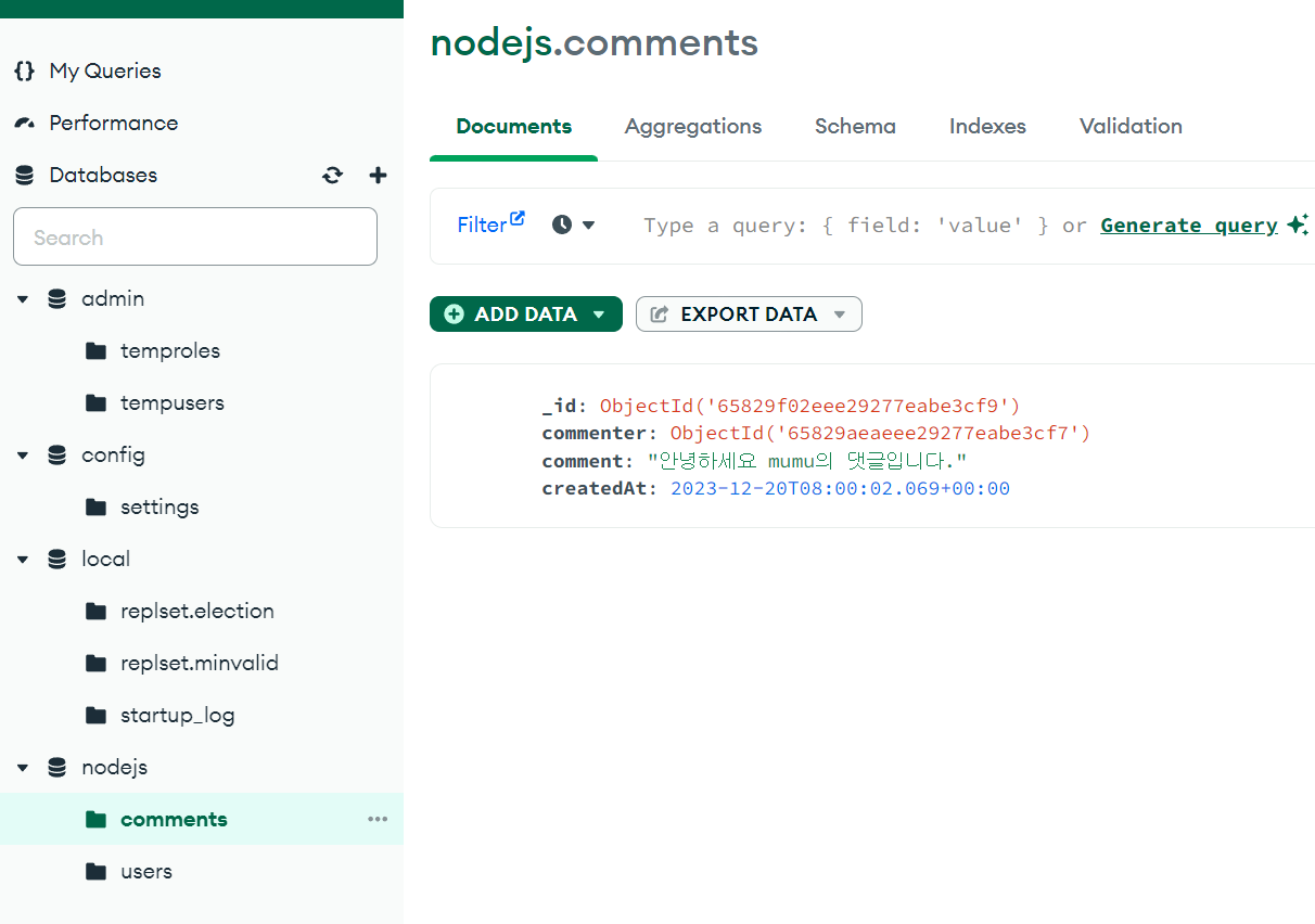 nodejs> db.comments.insertOne({ commenter: ObjectId("65829aeaeee29277eabe3cf7"), comment: '안녕하세요 mumu의 댓글입니다.', createdAt: new Date()});