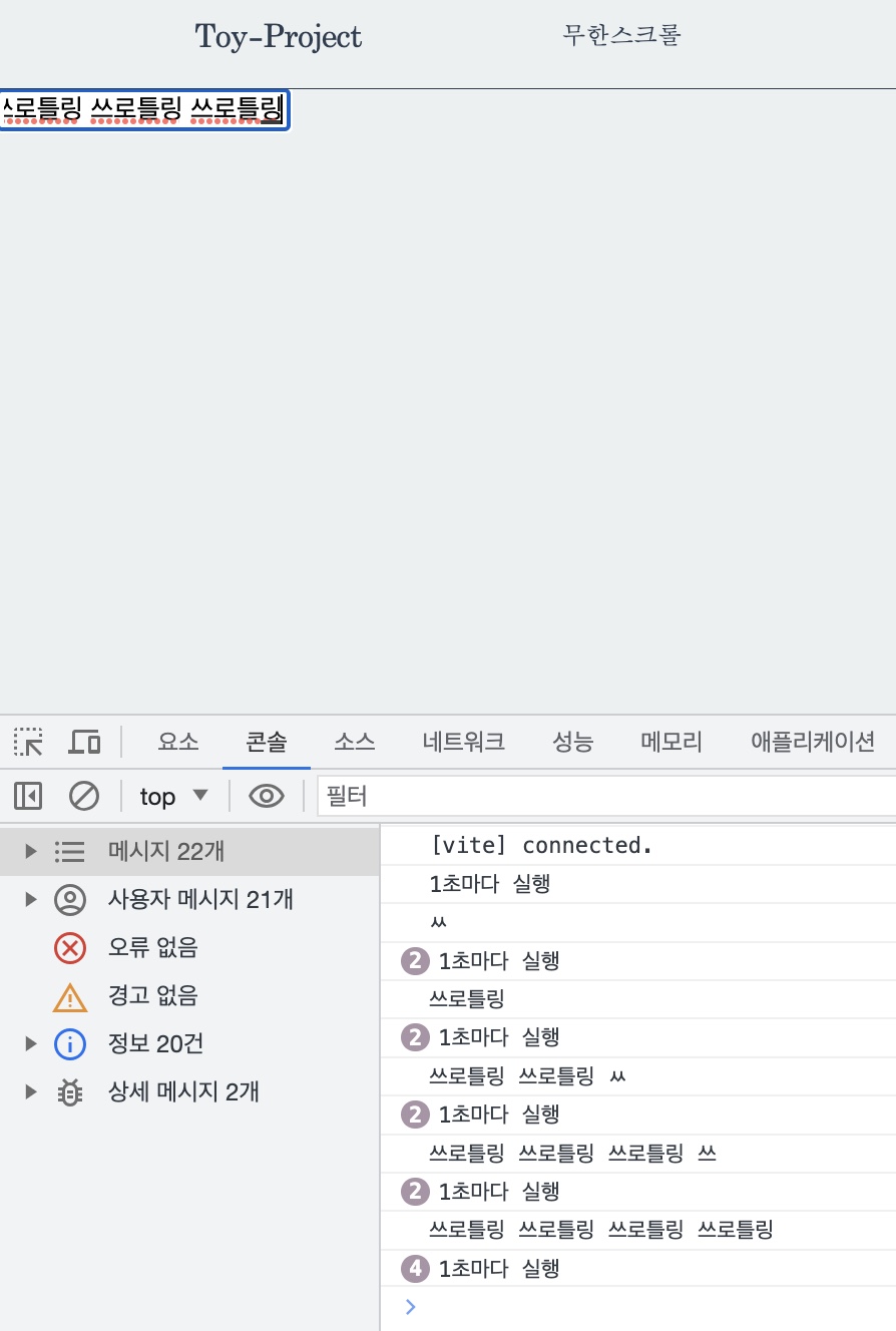 그러나 Scroll이 발생할 때마다 스크롤 이벤트에 대한 콜백 함수가 여러 번 실행되는 것을 확인할 수 있습니다. 현재는 console.log를 사용하고 있지만, 만약 API 요청과 같이 많은 데이터를 다루는 상황이라면 엄청난 성능 저하가 발생할 수 있습니다.