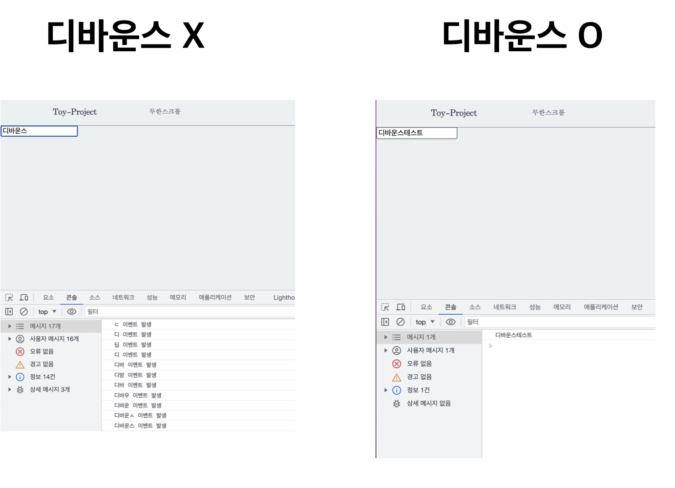 만약 디바운스를 사용하지 않았다면 디바운스라는 단어를 검색하기 위해 ㄷ, 디, 딥, 디바, ... 등 11번의 단어를 API 요청해야 했을 것이며, 이는 엄청난 성능 문제를 발생시킬 수 있습니다.