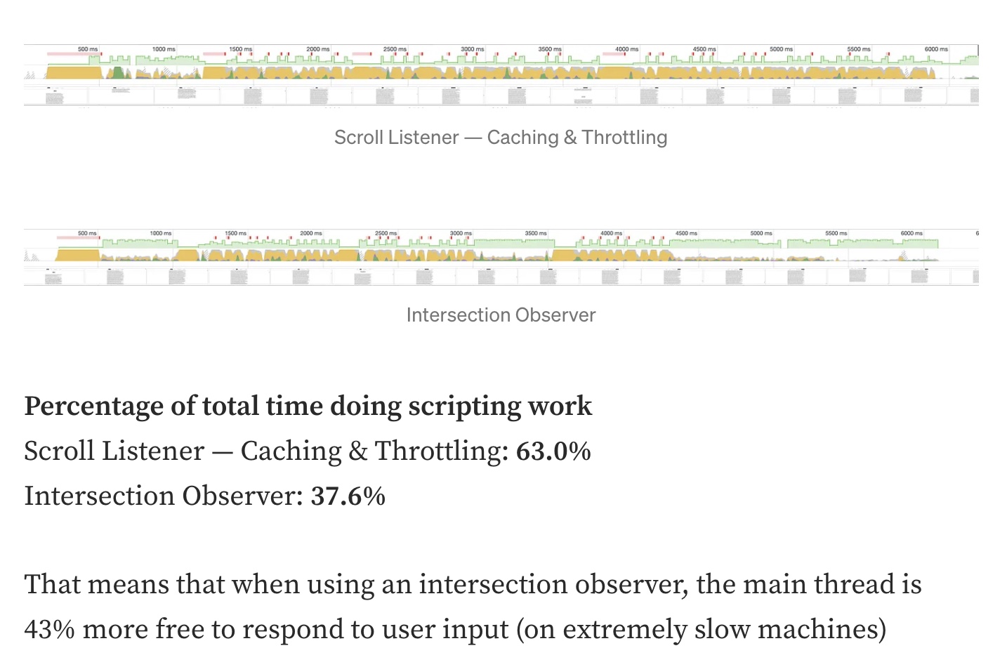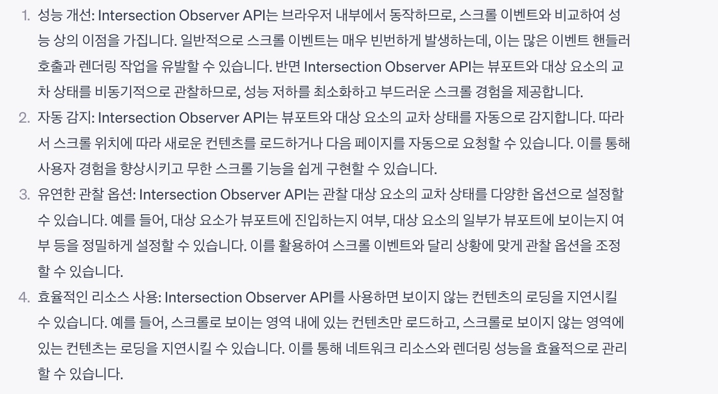 무한 스크롤 구현을 쓰로틀기법이 있는데도 불구하고 많은 분들이 Intersection Observer API를 사용 하는 걸 찾아볼 수 있습니다.