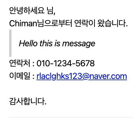 단 이때 {{...}}의 값들은 이후 코드의 form의 name과 같아야 한다. Ex) from_name, phone, email, message