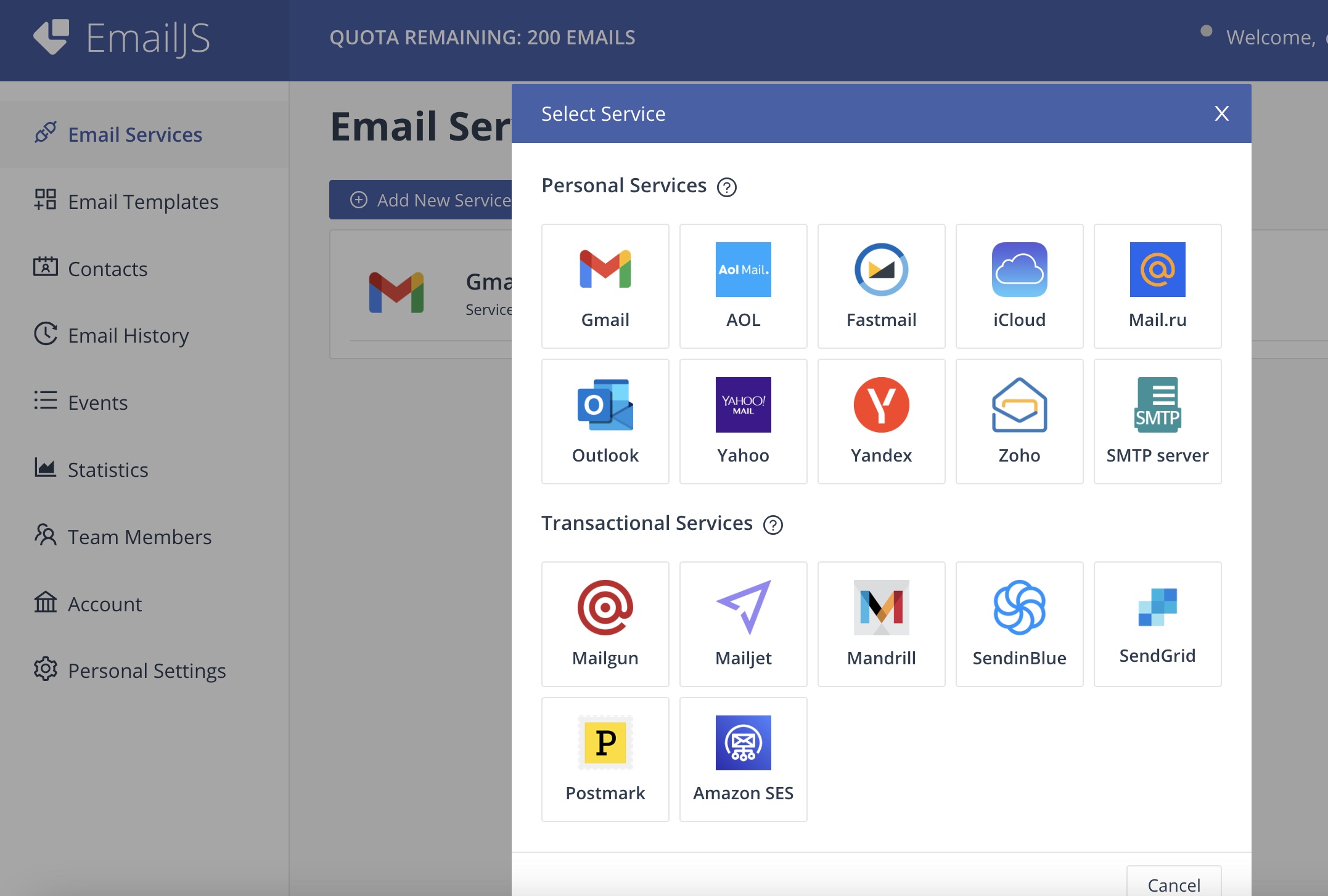 EamilJs에 회원가입 후 왼쪽 상단에 Eamil Service 창에서 원하는 서비스를 선택해준다.