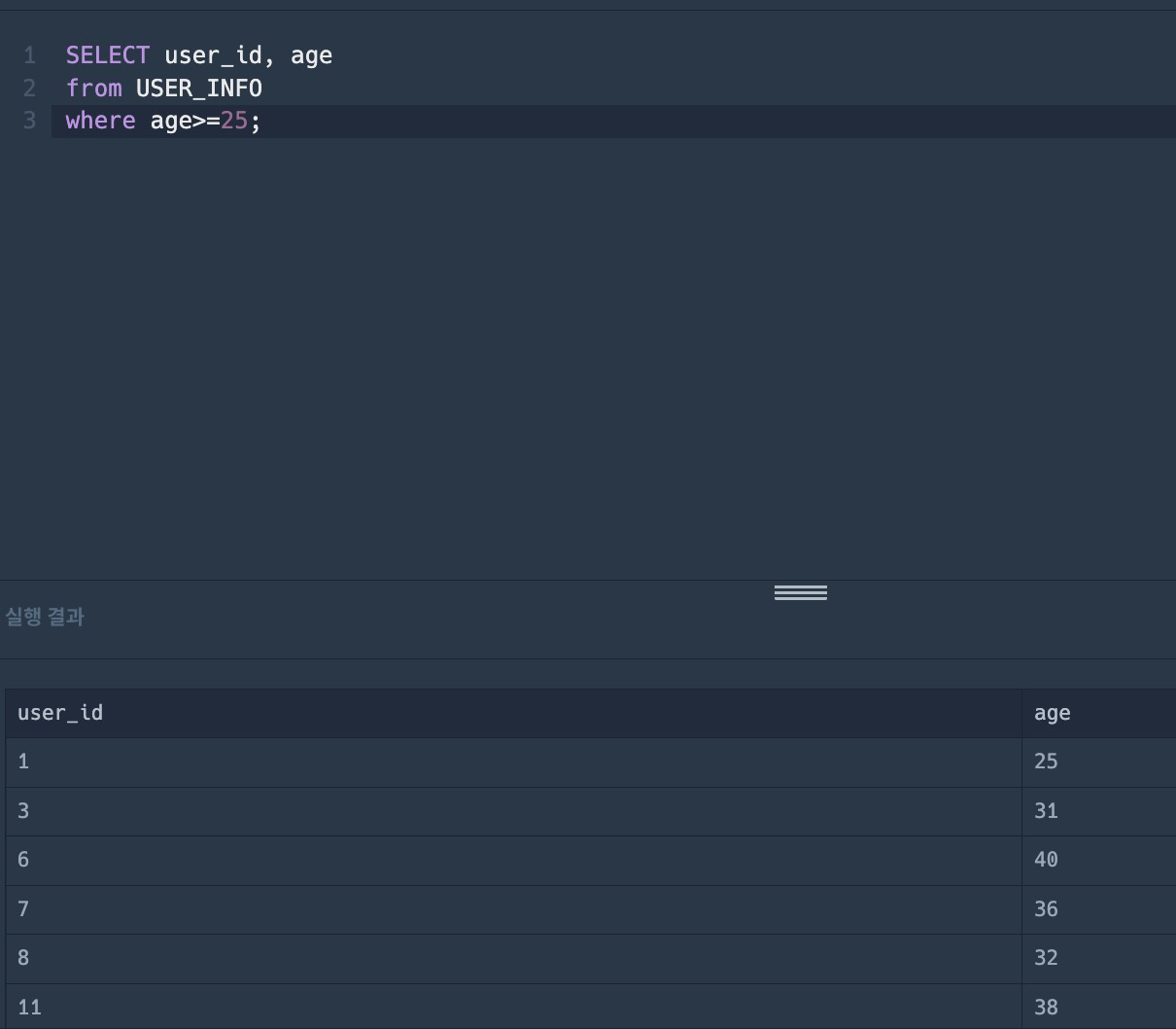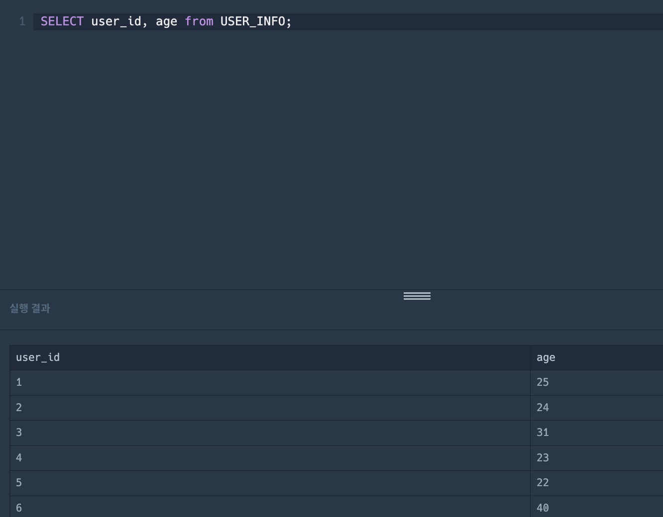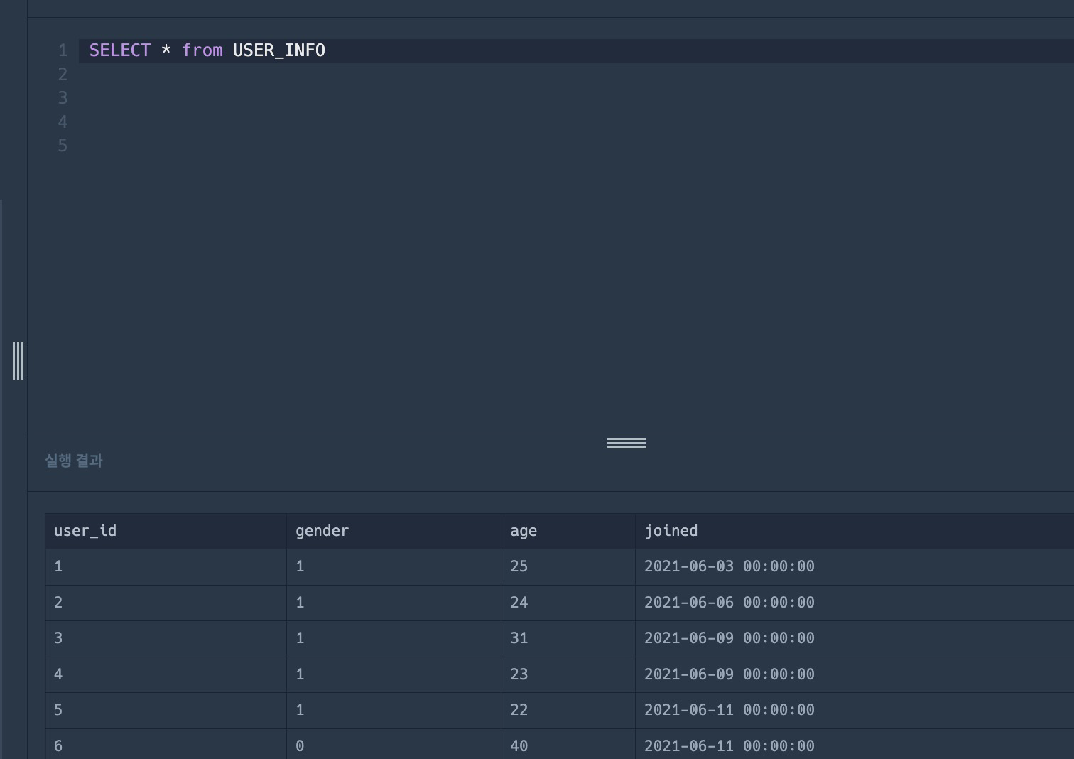 만약 모든 컬럼을 조회하고 싶다면 *를 사용할 수 있습니다. select * from user