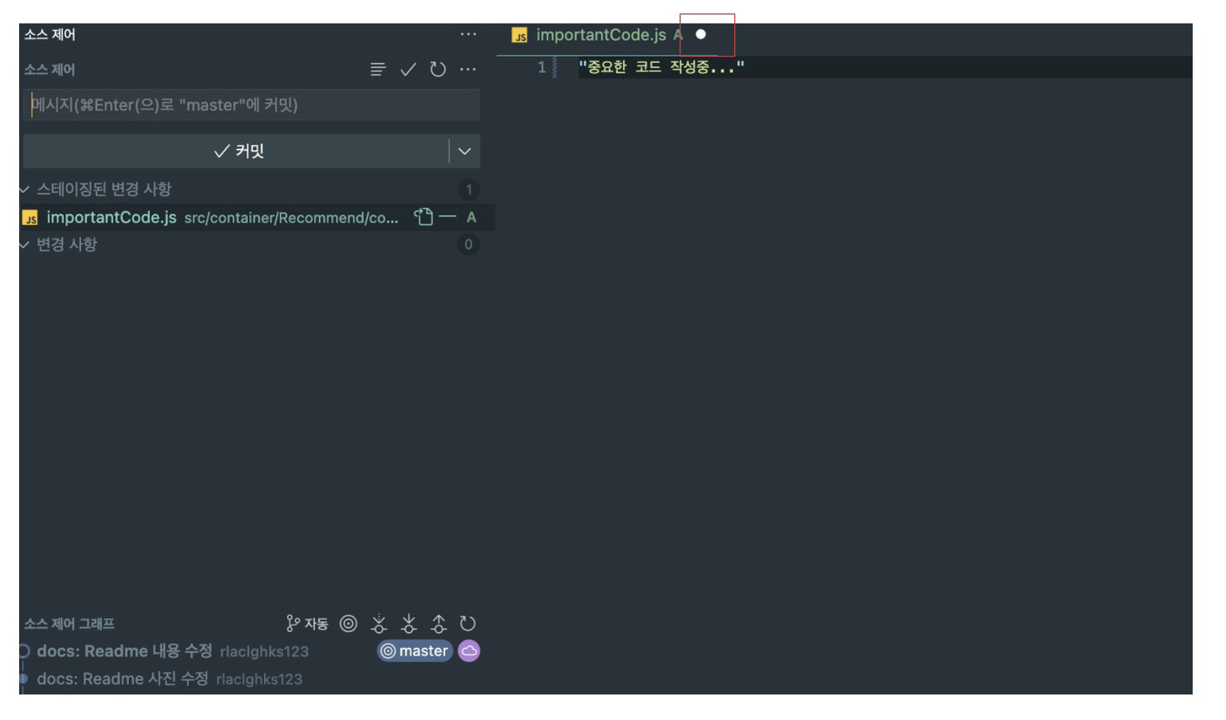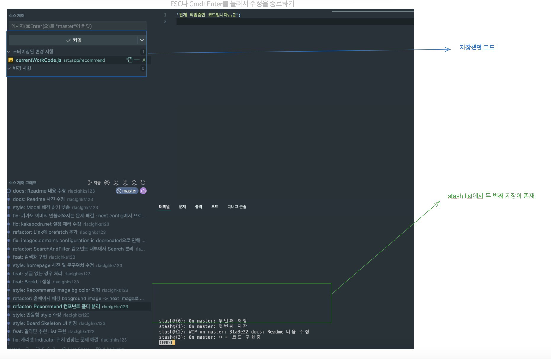 git stash save '중요한 코드 저장' 명령어를 통해 stash에 저장합니다.