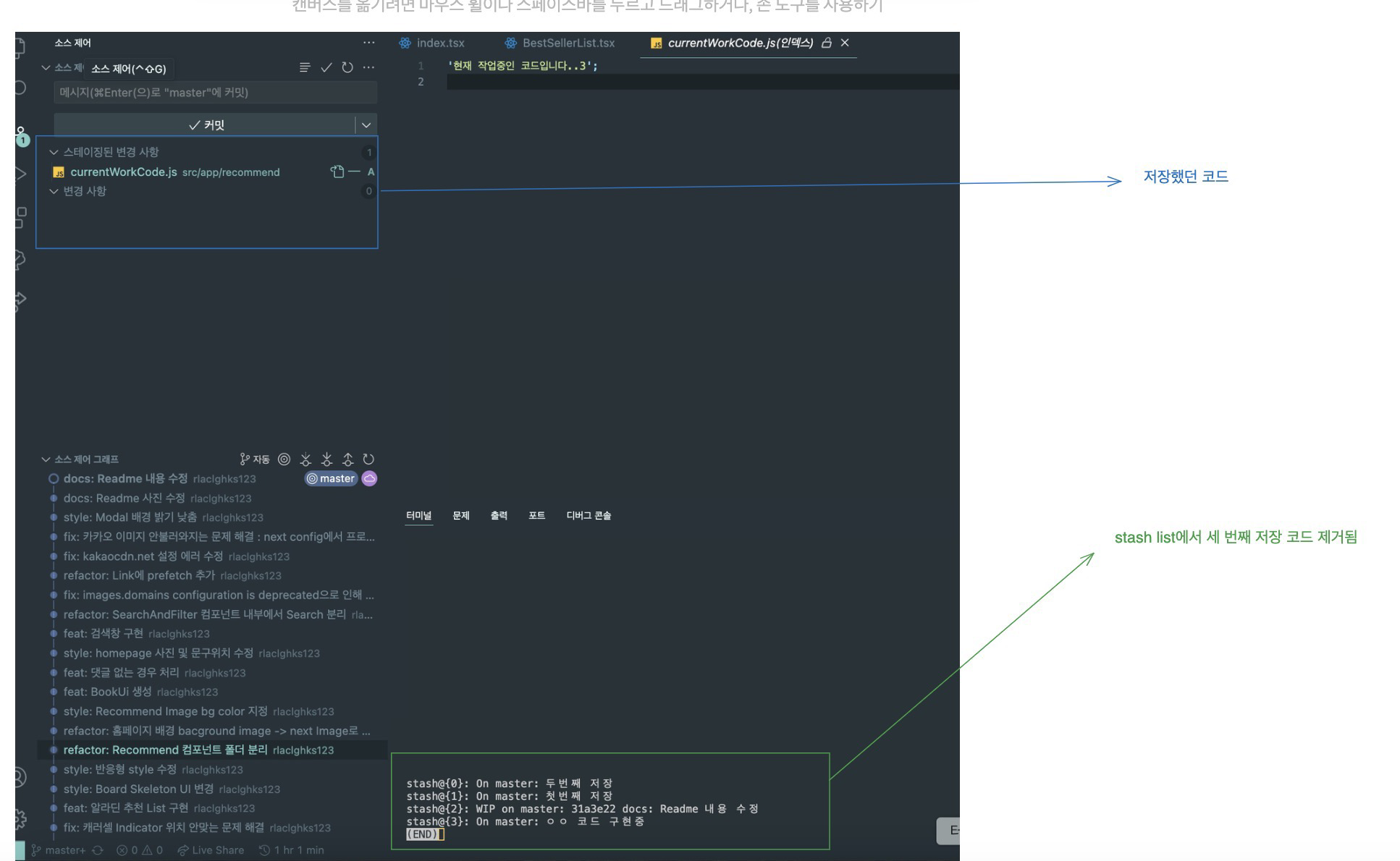 다시 stash 저장된 코드 불러오는 방법