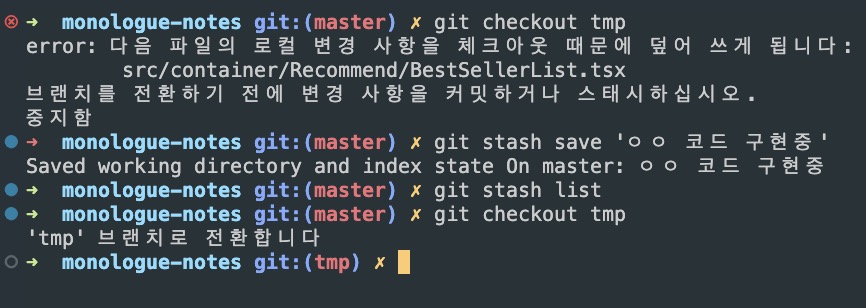 git stash save 'stash message'git stash list 저장 후 다른 branch로 이동 가능합니다.