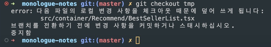 현재 코드 작성 중 다른 사람의 PR 혹은 여러가지 이유로 다른 브랜치로 이동하려고 하면 아래와 같은 문구가 나타납니다.